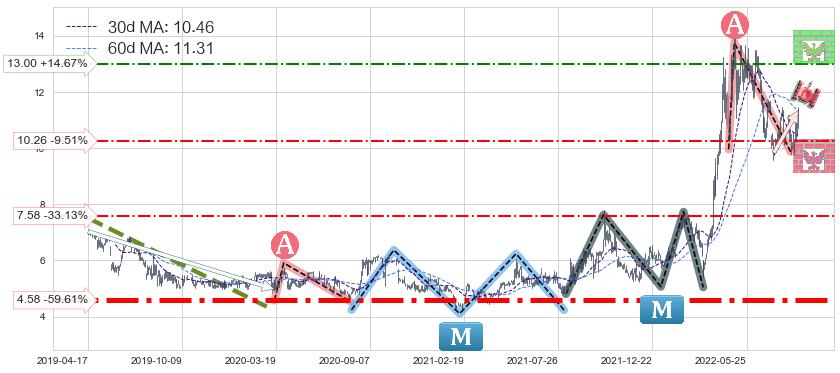 ♘ 支撑价格位10.26,可信任强度40.47%,距离最后交易2022-08-12形成的收盘价格11.34相差 -9.51%