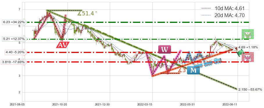 ♘ 阻力价格位5.21,可信任强度67.54%,距离最后交易2022-08-12形成的收盘价格4.64相差 +12.37%