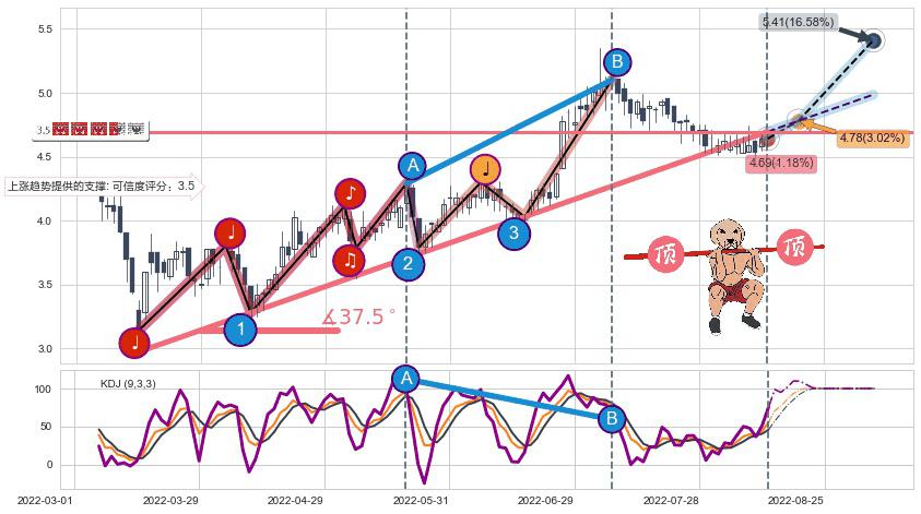 ♘ 阻力价格位6.23,可信任强度75.46%,距离最后交易2022-08-12形成的收盘价格4.64相差 +34.22%