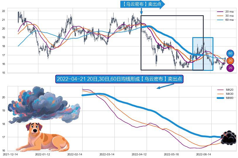 ⚀ 2022-02-14日-2022-06-27日显现 20日-30日-60日均线 【乌云密布】卖出点 看空信号,后市看跌,卖出