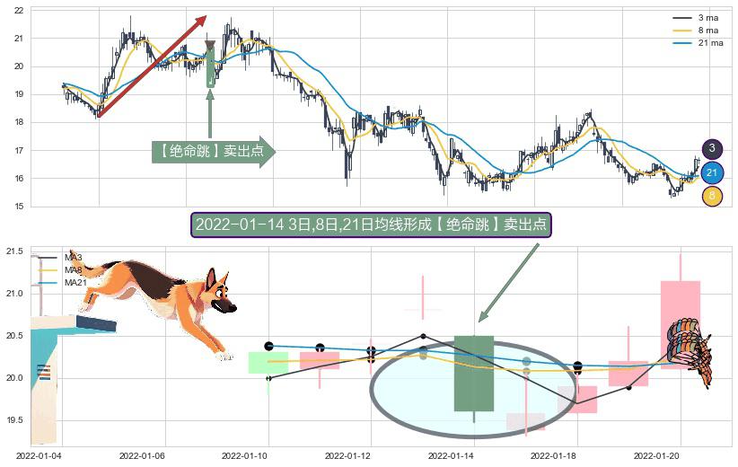 ⚀ 2022-01-14日显现 3日-8日-21日均线 【绝命跳】卖出点 看空信号,后市看跌,卖出