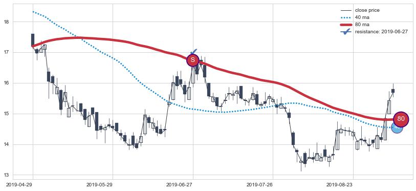 ➢ 最优均线组合共正确确认支撑阻力信号3处,正确确认率 75.00%