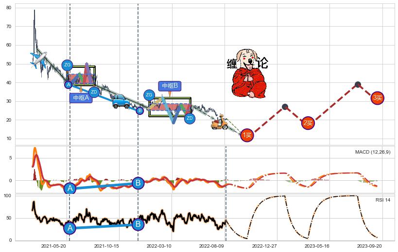 | 2 🅚:【高山滑雪】买入点 ➕ 🌊:波浪理论猜想下跌浪5已形成,猜想后续形成abc反弹上涨(均值回复) ☞ 看多信号 ⇥ 【均线】交织【图形】⇥ 综合量化分数: 54 | > |