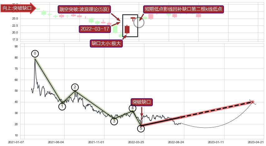 ➣ 突破缺口形成后,后续k已经超过14根,跳空突破波浪理论(5浪)关键点后, 出现【轻微回踩】迹象,短期低点影线回补缺口第二根k线低点