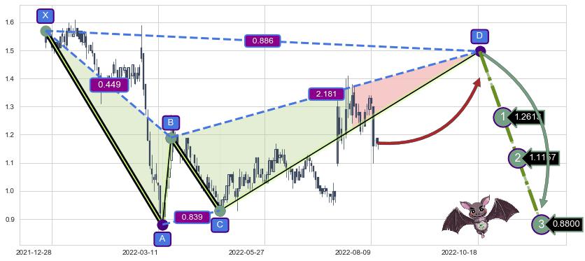 ➣ 未完成【蝙蝠】形态起点X: 2021-12-22, 已到达C点: 2022-04-26, 预测最终D点: 2022-10-19, 共193交易日