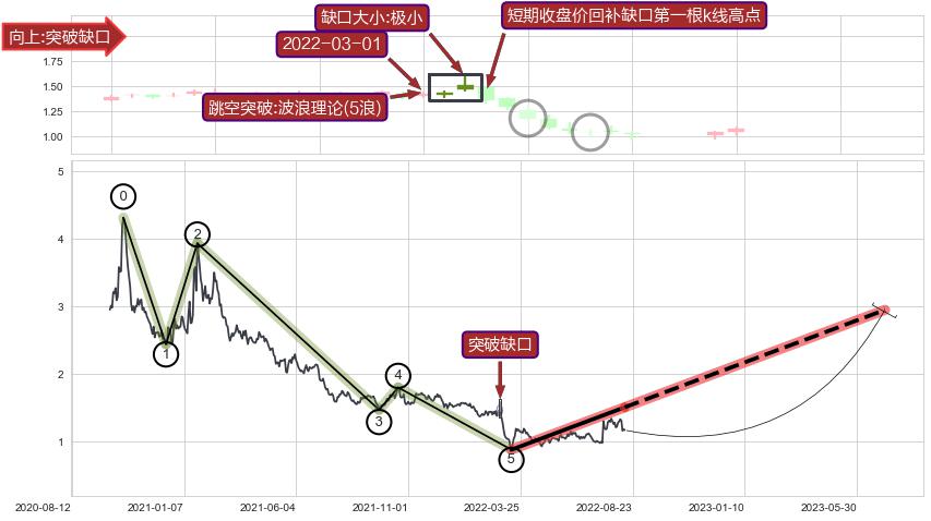 ➢ 突破缺口形成后,后续k已经超过14根,跳空突破波浪理论(5浪)关键点后, 出现【完全回踩】迹象,短期收盘价回补缺口第一根k线高点