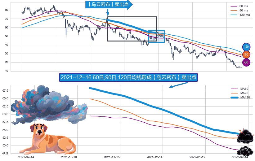 ⚀ 2021-10-26日-2022-02-09日显现 60日-90日-120日均线 【乌云密布】卖出点 看空信号,后市看跌,卖出