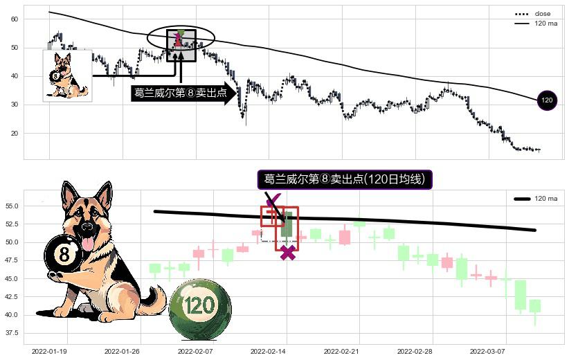⚀ 2022-02-14-日显现 葛兰威尔均线 120日均线 第⑧卖出点 下降趋势的中继信号,后市看跌,卖出信号