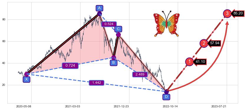 ➣ 已完成【蝴蝶】形态起点X: 2020-04-06, 终点D: 2022-08-10, 共574交易日