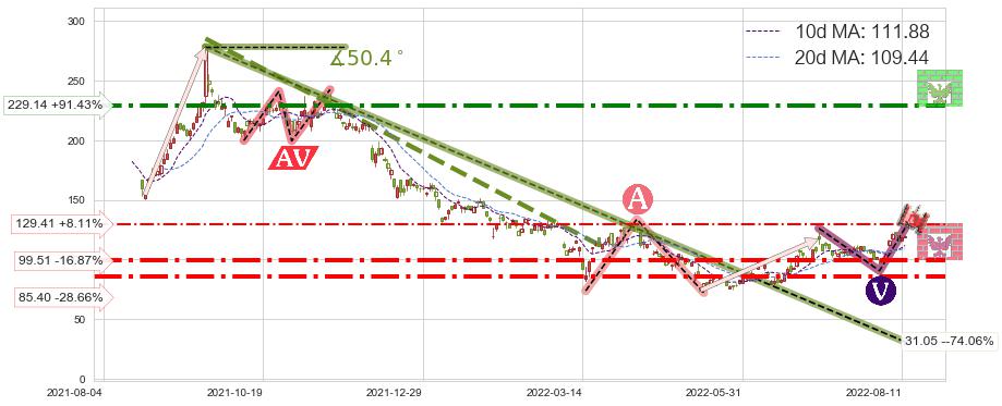 ♘ 支撑价格位99.51,可信任强度70.64%,距离最后交易2022-08-12形成的收盘价格119.70相差 -16.87%