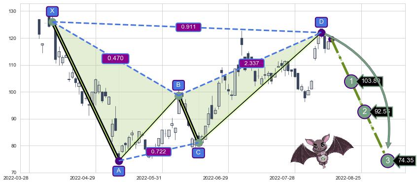 ➣ 已完成【蝙蝠】形态起点X: 2022-04-08, 终点D: 2022-08-09, 共82交易日