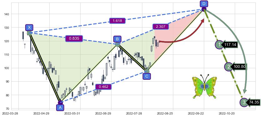 ➣ 未完成【蝴蝶】形态起点X: 2022-04-08, 已到达C点: 2022-08-02, 预测最终D点: 2022-09-22, 共111交易日