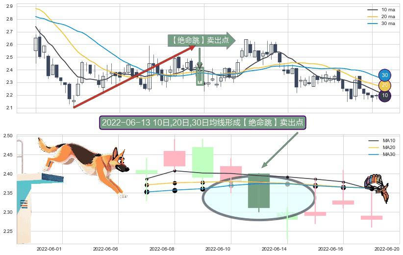 形态多维评估: ⚀ 2022-06-13日显现 10日-20日-30日均线 【绝命跳】卖出点 看空信号,后市看跌,卖出