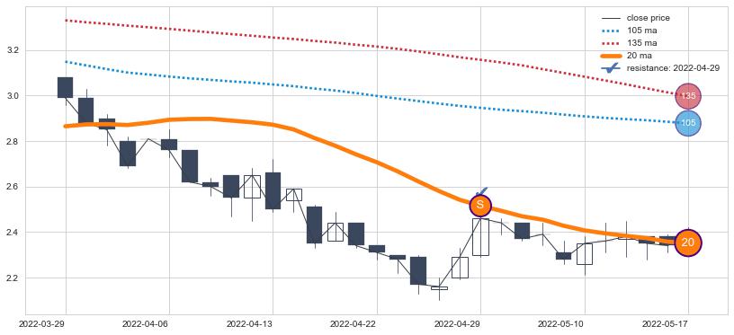 下跌趋势2022-03-29-2022-05-17,均线20确认关键阻力1处