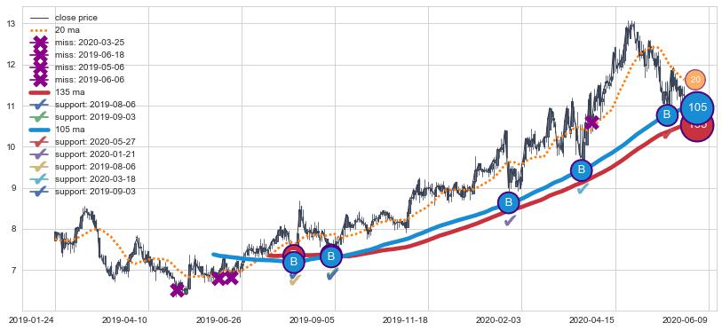 上涨趋势2019-01-24-2020-06-09,均线105, 135确认关键支撑5处
