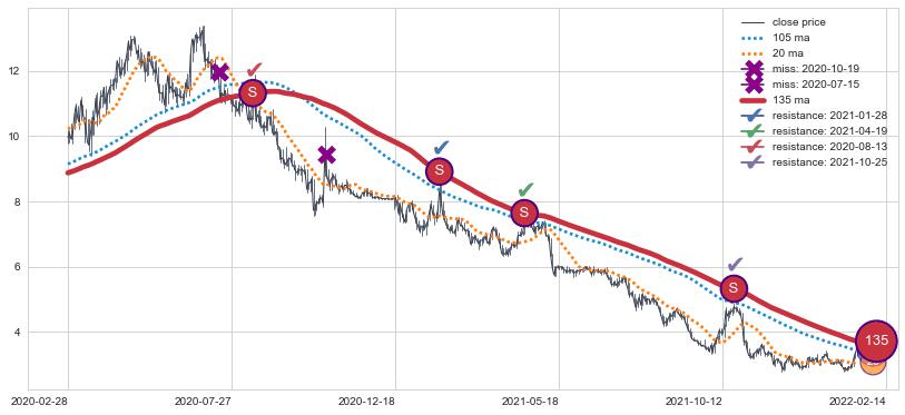 下跌趋势2020-02-28-2022-02-14,均线135确认关键阻力4处