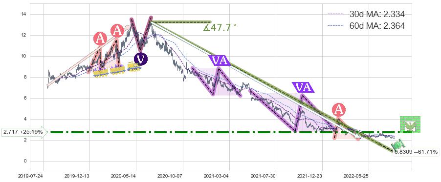 ♘ 阻力价格位2.717,可信任强度71.12%,距离最后交易2022-08-12形成的收盘价格2.170相差 +25.19%