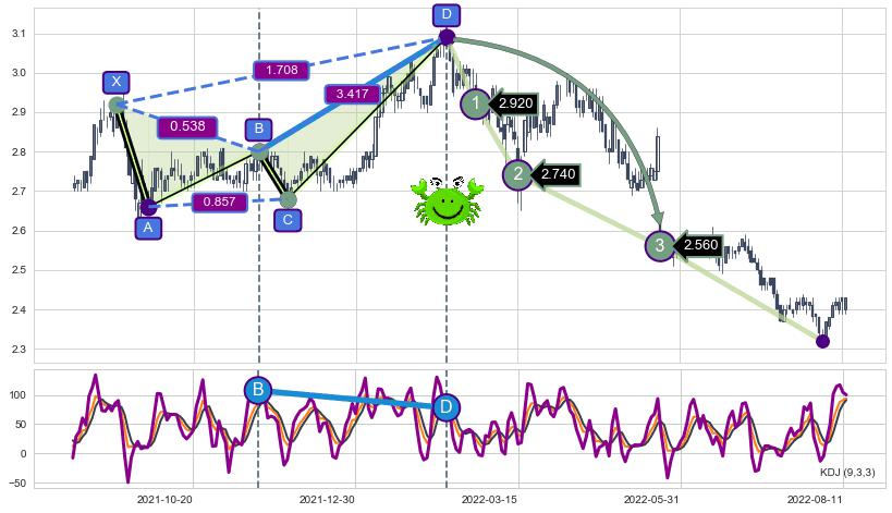 ➣ 已完成【螃蟹】形态起点X: 2021-09-10, 终点D: 2022-02-11, 共103交易日
