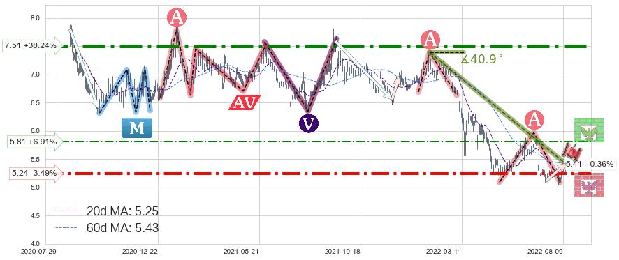 ♘ 阻力价格位5.81,可信任强度47.29%,距离最后交易2022-08-12形成的收盘价格5.43相差 +6.91%
