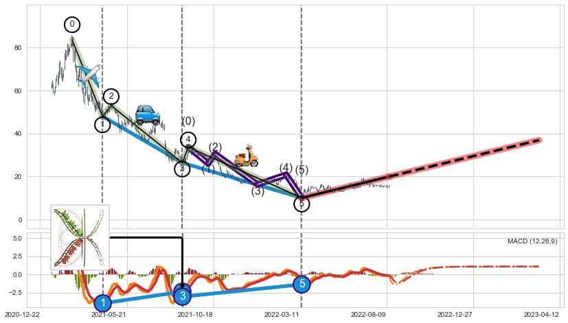 ➣ 第一, 三, 五浪下跌动能逐渐【衰弱变小】,趋势呈现不稳迹象