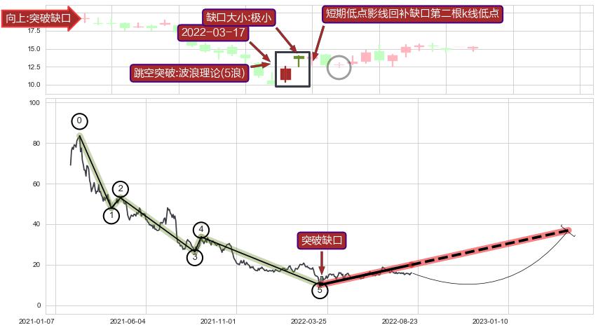 ➣ 突破缺口形成后,后续k已经超过14根,跳空突破波浪理论(5浪)关键点后, 出现【轻微回踩】迹象,短期低点影线回补缺口第二根k线低点