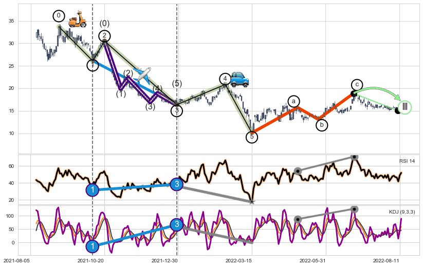 ➣ a,c调整浪MACD, RSI, KDJ走势都【未出现】背离,abc走势延续, 5浪反转概率增强