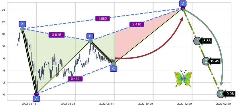 ➣ 未完成【蝴蝶】形态起点X: 2022-02-17, 已到达C点: 2022-08-10, 预测最终D点: 2022-12-13, 共207交易日