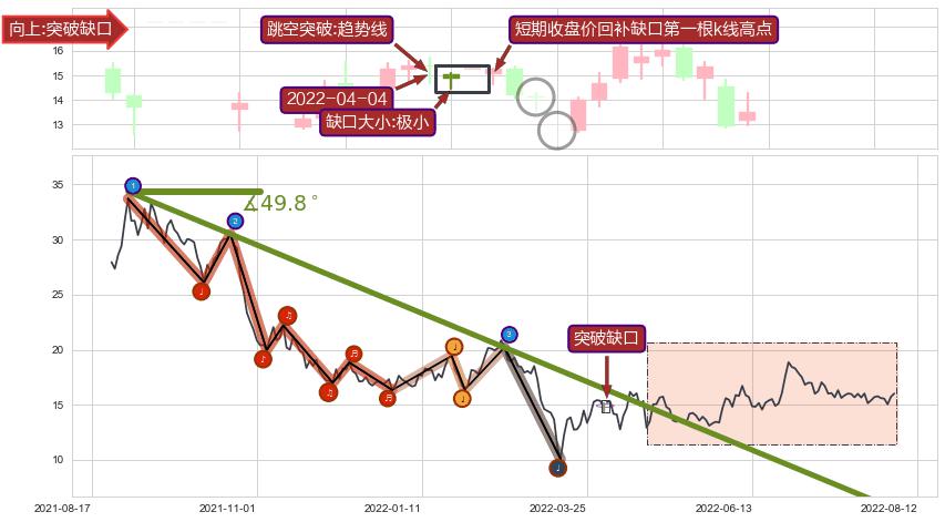 ➢ 突破缺口形成后,后续k已经超过14根,跳空突破趋势线关键点后, 出现【完全回踩】迹象,短期收盘价回补缺口第一根k线高点