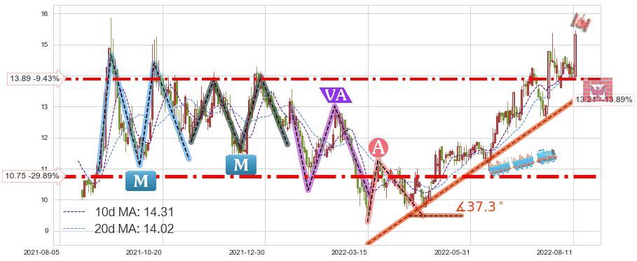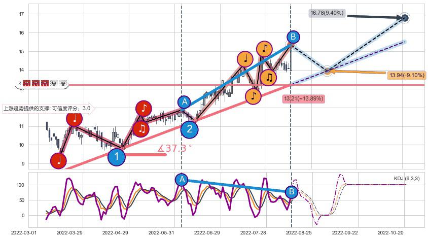 ♘ 支撑价格位13.89,可信任强度77.59%,距离最后交易2022-08-12形成的收盘价格15.34相差 -9.43%