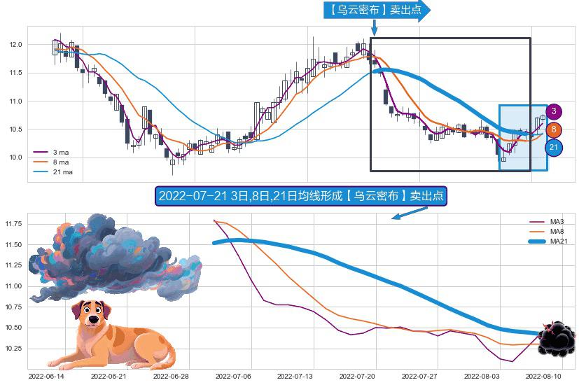 形态多维评估: ⚀ 2022-06-30日-2022-08-09日显现 3日-8日-21日均线 【乌云密布】卖出点 看空信号,后市看跌,卖出