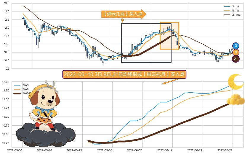 形态多维评估: ⚀ 2022-05-24日-2022-06-28日显现 3日-8日-21日均线 【烘云托月】买入点 看多信号,后市看涨,买入