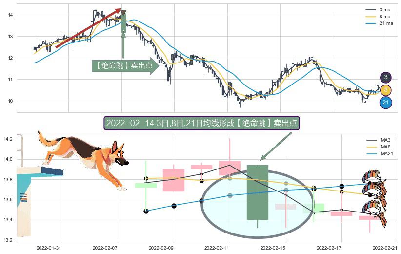 形态多维评估: ⚀ 2022-02-14日显现 3日-8日-21日均线 【绝命跳】卖出点 看空信号,后市看跌,卖出