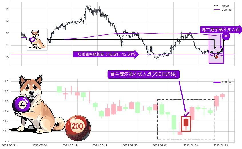 形态多维评估: ⚀ 2022-08-04-日显现 葛兰威尔均线 200日均线 第④买入点 下降趋势均值回复的短线反弹信号,后市看涨,买进信号