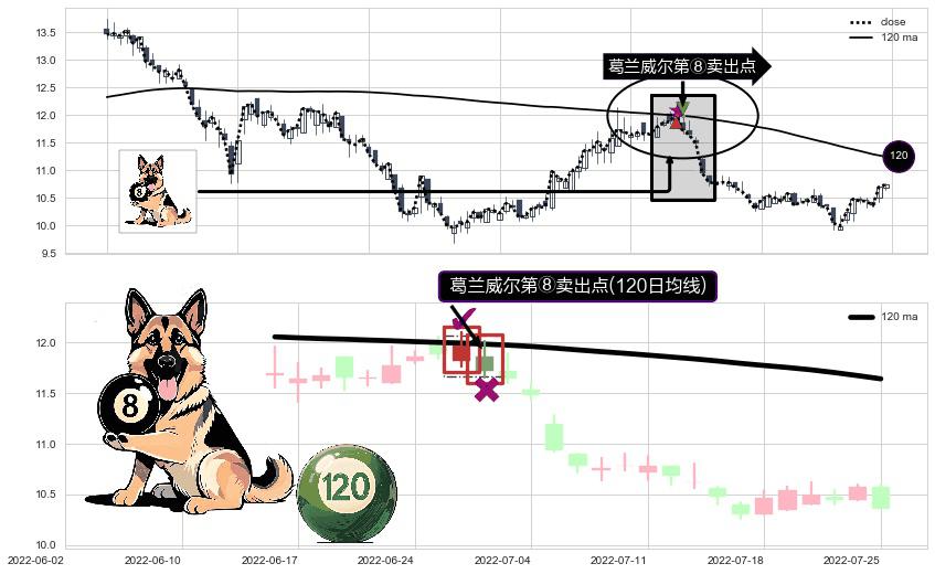 形态多维评估: ⚀ 2022-06-29-日显现 葛兰威尔均线 120日均线 第⑧卖出点 下降趋势的中继信号,后市看跌,卖出信号