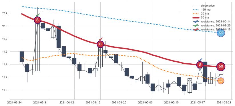 下跌趋势2021-03-24-2021-05-21,均线50确认关键阻力3处