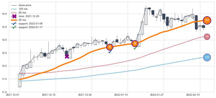 上涨趋势2021-12-01-2022-02-16,均线20确认关键支撑2处