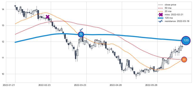下跌趋势2022-01-21-2022-06-16,均线120确认关键阻力1处