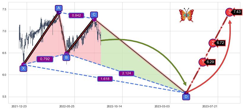 ➣ 未完成【蝴蝶】形态起点X: 2021-12-14, 已到达C点: 2022-07-25, 预测最终D点: 2023-04-20, 共342交易日