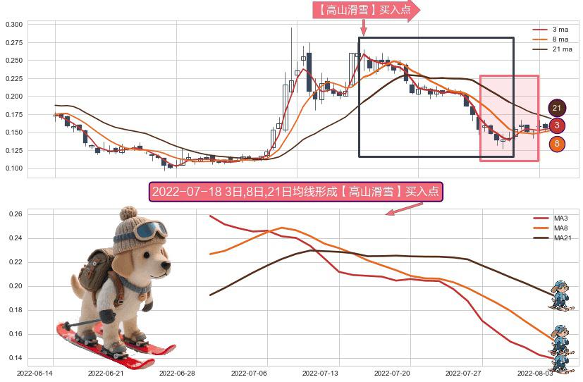 形态多维评估: ⚀ 2022-06-29日-2022-08-03日显现 3日-8日-21日均线 【高山滑雪】买入点 看多信号,后市看涨,买入