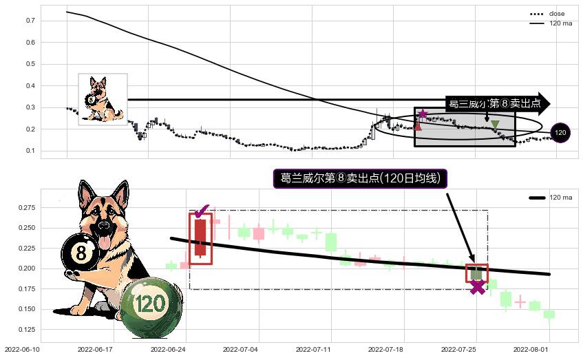 形态多维评估: ⚀ 2022-07-25-日显现 葛兰威尔均线 120日均线 第⑧卖出点 下降趋势的中继信号,后市看跌,卖出信号