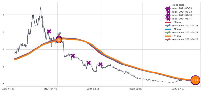下跌趋势2020-11-19-2022-07-29,均线144, 140, 135确认关键阻力1处