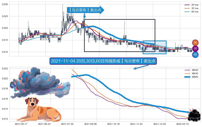 ⚀ 2021-07-28日-2022-02-28日显现 20日-30日-60日均线 【乌云密布】卖出点 看空信号,后市看跌,卖出