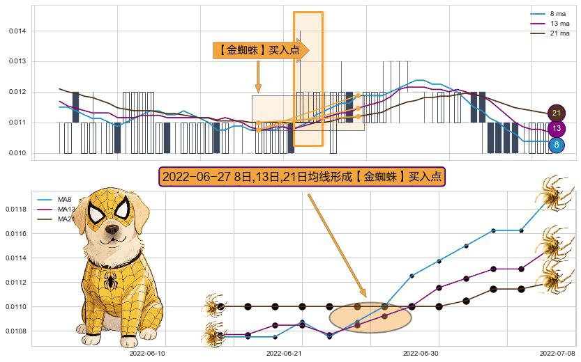⚀ 2022-06-27日显现 8日-13日-21日均线 【金蜘蛛】买入点 看多信号,后市看涨,买入