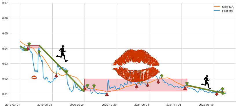 2021-11-24至2022-08-12 慢线与快线呈空头排列, 慢线与快线接触少,无缠绕