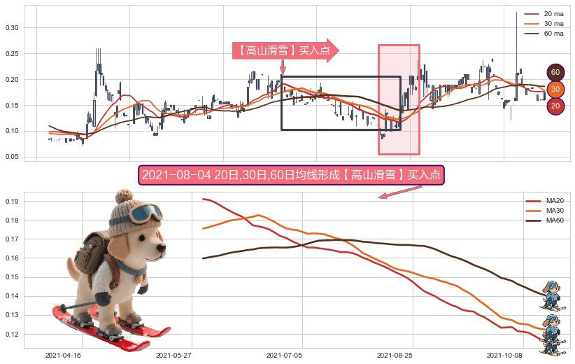 ⚀ 2021-05-31日-2021-10-21日显现 20日-30日-60日均线 【高山滑雪】买入点 看多信号,后市看涨,买入