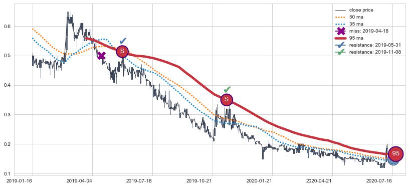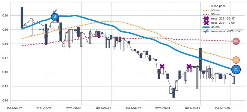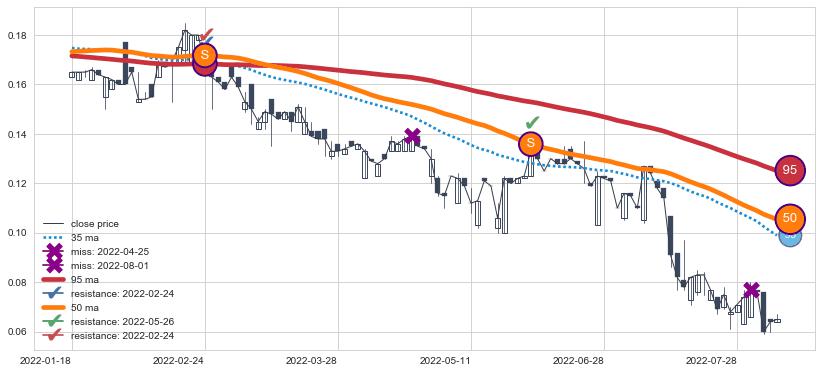 ⚄ 价格在均线遇到阻力后已再次向下回落了【极长】距离, 第⑦卖出点 阻力效果得到【明确确认】
