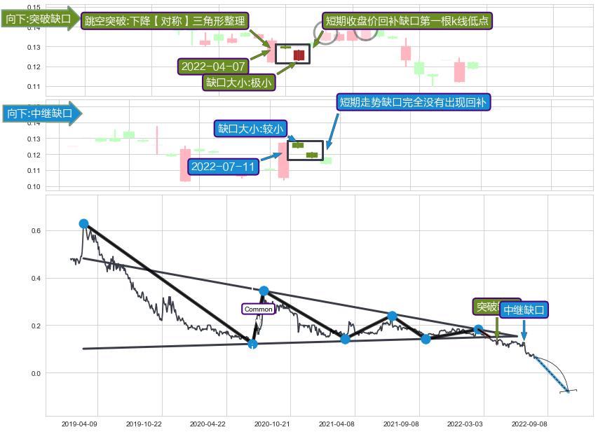 ➢ 突破缺口形成后,后续k已经超过14根,跳空突破下降【对称】三角形整理关键点后, 出现【完全回踩】迹象, 但后续走势回踩幅度持续降低,缺口压制继续,短期收盘价回补缺口第一根k线低点