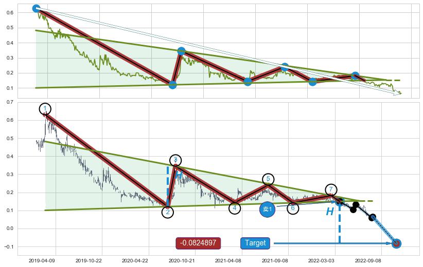 ➢ 最小中继整理跌幅→𝐇: 0.232296 (低点逐步抬高斜边第一支撑点②与阻力边垂直距离)