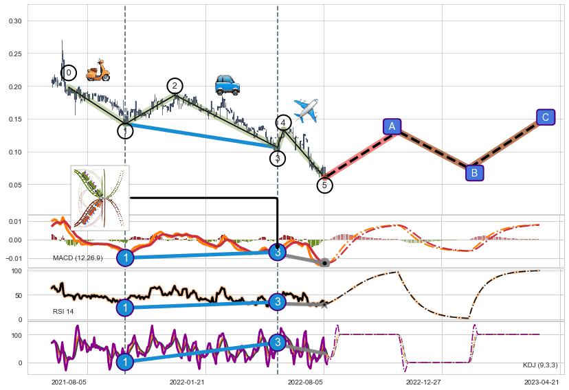 ➣ 1,3,5驱动浪MACD, RSI, KDJ走势都出现【常规背离】反转信号增强