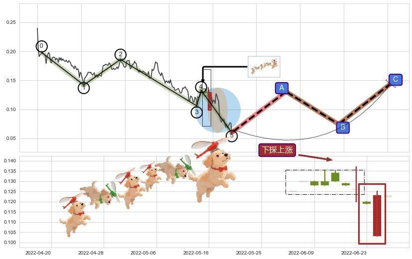 | 8 🅚:上涨螺旋桨形态 ➕ 🌊:波浪理论猜想下跌浪5已形成,猜想后续形成abc反弹上涨(均值回复) ☞ 看多信号 ⇥ 【🅚线】交织【图形】⇥ 综合量化分数: 59 | > |